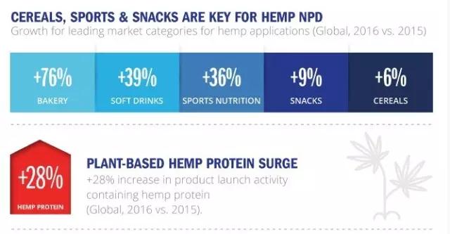 火麻在食品中的的应用非常广泛,几乎涉及各个品类,如零食、Smoothie、果汁、风味水、烘焙食品、营养棒、早餐麦片和饼干等。Innova数据显示,软饮料、运动营养、零食和谷物是火麻类产品新产品开发的主要领域,而在全球烘焙食品中,火麻的应用增长了76%(2016年 vs 2015年)。