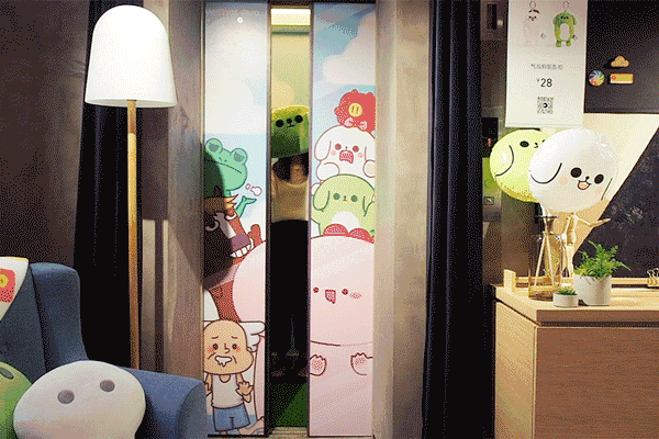 还有一扇藏在窗帘后面的电梯门,被装饰成了互动“寻宝”区:▼