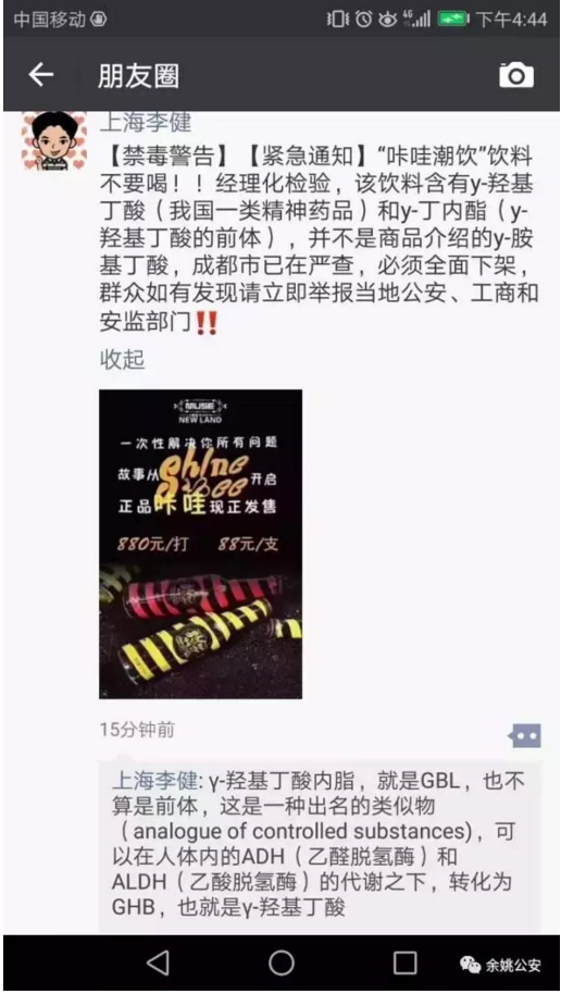 为此,余姚公安发布禁毒预警:“咔哇”饮料不要喝!!经理化检验,该饮料含有y-羟基丁酸(我国一类精神药品)和y-丁内酯(y-羟基丁酸的前体),并不是商品介绍的y-胺基丁酸,属于新型毒品!