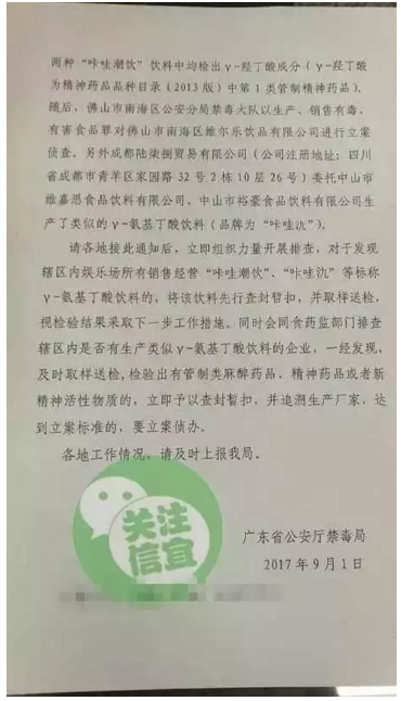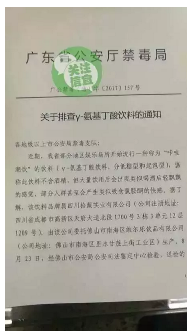 广东省公安厅禁毒局的文件《关于排查Y-氨基丁酸饮料的通知》,其中一段写到:近期,我省部分地区娱乐场所开始流行一种称为“咔哇潮饮”的饮料(Y-氨基丁酸饮料,分低糖型和起泡型),据称此饮料不含酒精,但大量饮用后会出现类似喝酒后轻飘飘的感觉,部分人群甚至产生类似吸食氯胺酮的快感。