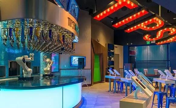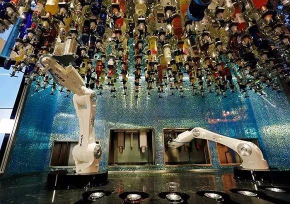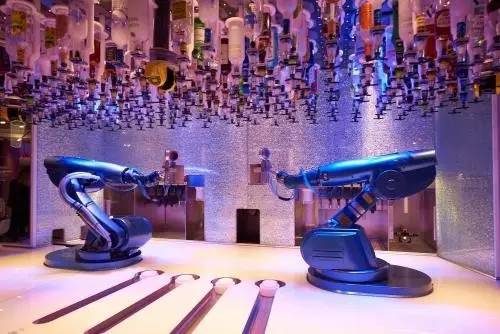 整个空间都是以智能为标准,包括iPad的点单系统,酒吧内没有熟悉的调酒师,取而代之的是接到点单后,它们会伸出长长的摇臂,从倒挂在房顶的各式酒款中,收集需要混调的基酒。