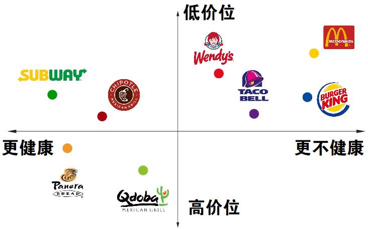 从上图我们可以看出麦当劳和汉堡王之类的品牌走的是虽然不健康,但是低价、高性价比的路线。