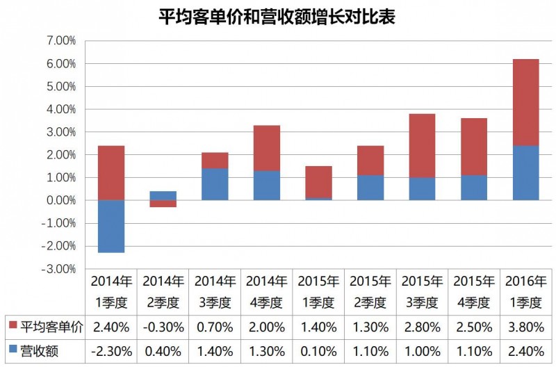 在2014年Q1时客流量出现下滑,只有依靠客单价的提高,勉强维持营收额没有下滑太多。
