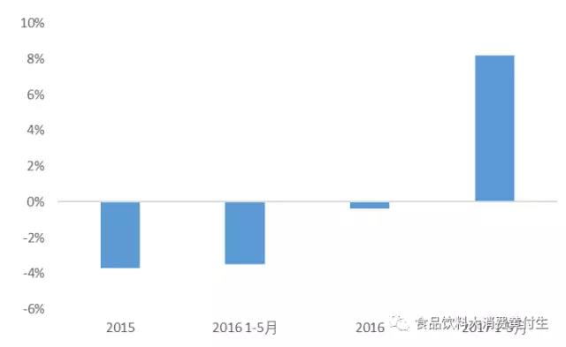 2017年1-5月,我国液态奶行业终端销售额同比增长约7%。其中常温酸奶和常温乳酸菌销售额同比增长分别约32%和31%,仍属于乳制品行业增长最快的子品类,占比持续提升;其他品类表现也都非常好,其中高端白奶销售额和销量同比增长均超过10%,仍维持两位数增长;基础白奶去年1-5月销售额同比下降约4.5%,今年1-5月同比增长8%左右,受益需求复苏非常明显。