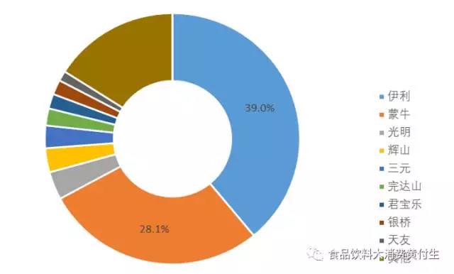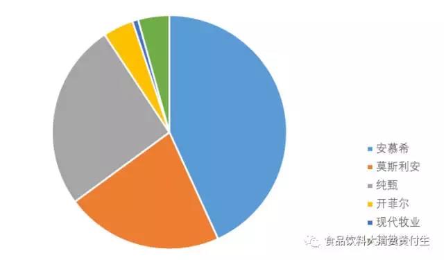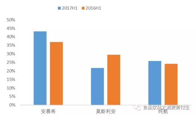 近两年,随着一线城市覆盖率的饱和,伊利和蒙牛凭借在二三线城市渠道和品牌方面的优势,逐渐缩小和光明的差距;2016年,伊利的“安慕希”销售额首次超过光明“莫斯利安”。 2017年上半年,伊利“安慕希”在常温酸奶中市占率位居第一,约43%,同比增长 6.2个百分点;光明“莫斯利安”为21.7%,同比继续下跌7.8个百分点;蒙牛“纯甄”为25.8%,同比提升1.6个百分点。