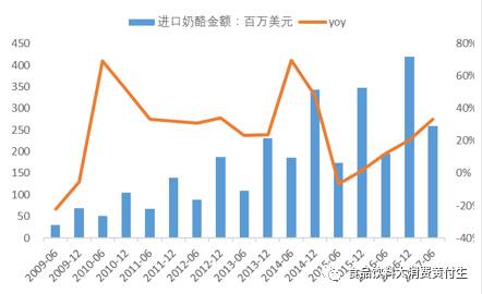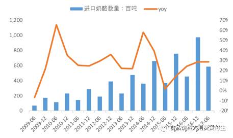 根据 Euromonitor 的数据,2006-2016年,国内奶酪消费量复合年均增长率约18%,销售额复合年均增长率约27%。其中,2016 年,我国国内奶酪消费量为 6.9 万吨,销售额超过 40 亿元,同比增长约14%。2010-2016年,我国奶酪进口量复合年均增长率约28.14%,进口额复合年均增长率约25.29%;2017年1-6月,我国进口奶酪量为5.86万吨,同比增长28.63%,进口额为2.59亿美元,同比增长33.28%。