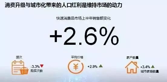 凯度消费者指数(在中国隶属于央视市场研究(CTR))对于中国城市家庭快速消费品的购买监测显示,今年1-6月整体市场 比去年同期增长2.6%,较去年同期相比有进一步放缓的趋势。在这个2.6%背后,我们观察到中国家庭的购买频次继续下跌,而增长的主要动力是价格上升和城市人口的增长。这表明中国市场的增长主要是消费升级和城市化带来的人口红利推动的,而消费量的增长相对疲软。