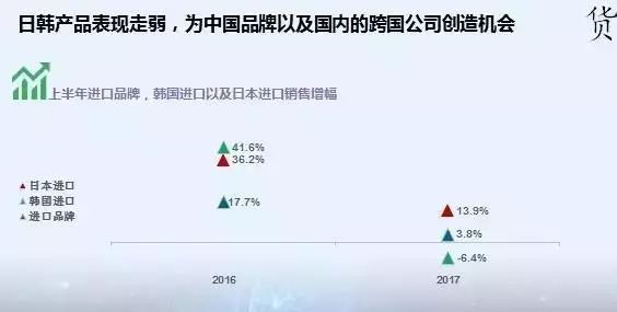 2017年上半年,我们观察到进口产品的增速明显放缓,而其中日韩产品对这一趋势有很大的影响。今年由于一些众所周知的原因,特别是韩国的化妆品在中国市场遭受了极大的阻力,销售业绩也受到了重创。而这给在中国经营的国际品牌以及中国本土品牌带来了机会。在中国运营的很多国际品牌在最近一年的销售趋势其实有所恢复。无论是跟消费者接触次数,还是他们购物篮金额都有所提升,表现出较为明显的恢复性增长。