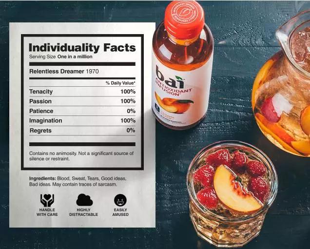 Bai是2009年成立于美国新泽西州的一家饮料公司,主打产品为Bai Antioxidant Infusion。2016年11月,Bai被胡椒博士集团(Dr Pepper Snapple Group)以17亿美元的价格收购。2017年2月5日,Bai在美国超级碗比赛中播出了该公司的第一个全国电视广告,并花费500万美元邀请当红歌手,格莱美奖获得者,同时也是公司的首席风味官Justin Timberlake和著名导演Christopher Walken为其代言。Bai系列饮料以其鲜明的风格和精准的定位在竞争激烈的市场中获得大众好评和多方关注。