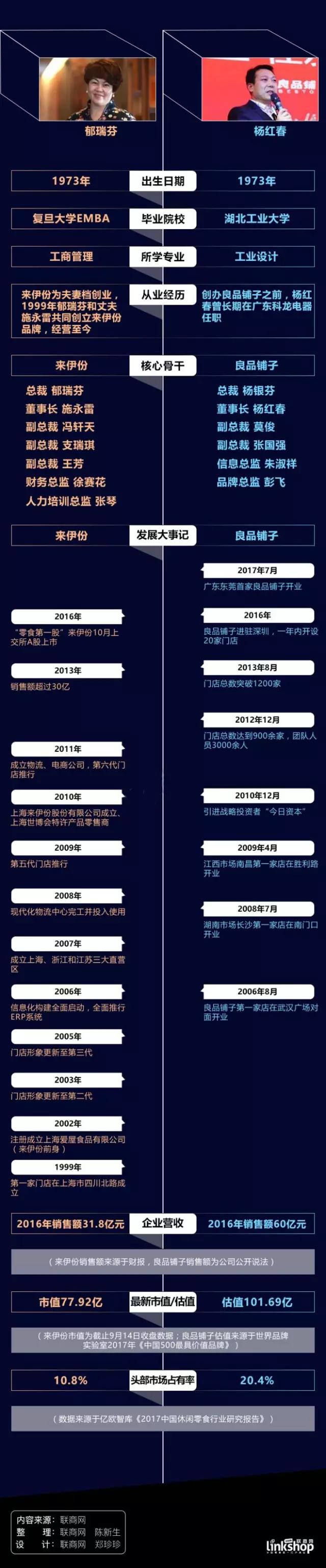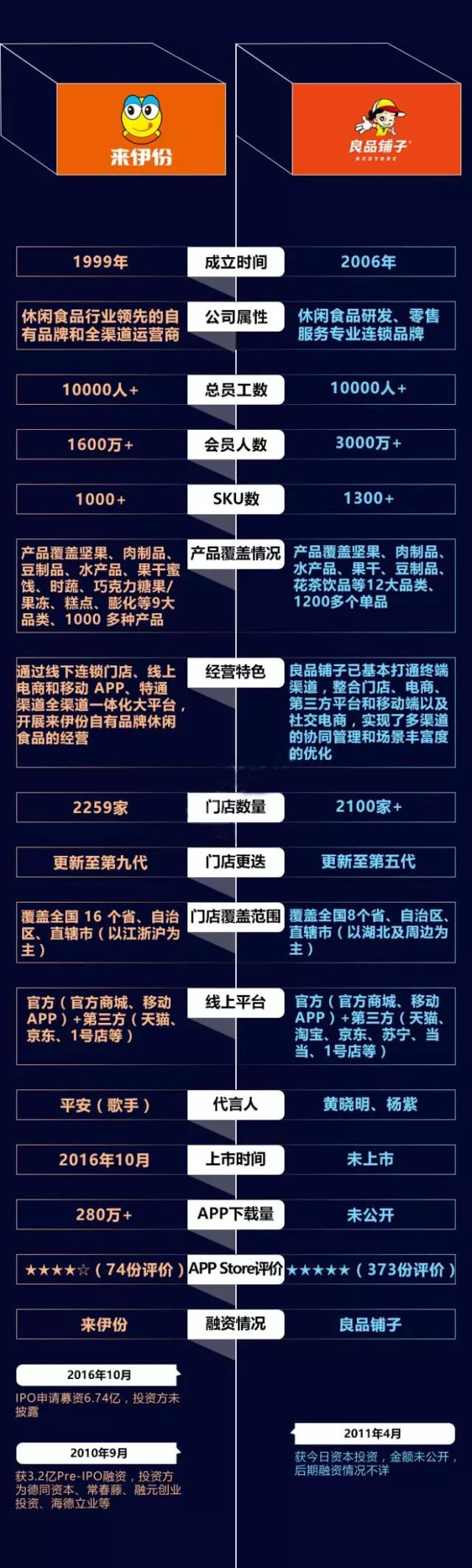 一个是从上海起家,成立于1999年的来伊份,一个是在武汉出生,成立于2006年的良品铺子。前者以“零食第一股”的身份于去年完成上市,后者虽未上市,但估值已达到百亿级别。
