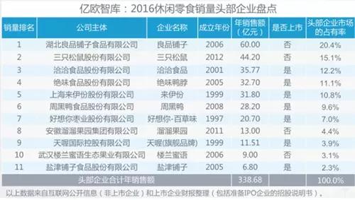 按照亿欧智库的统计,2016年休闲食品销量头部企业前五名中,良品铺子以20.4%的市场份额居头部企业市场第一位,紧随其后的是三只松鼠(15.1%,未上市)、洽洽食品(12.2%,已上市)、绝味鸭脖(11.1%,已上市)和来伊份(10.8%,已上市)。
