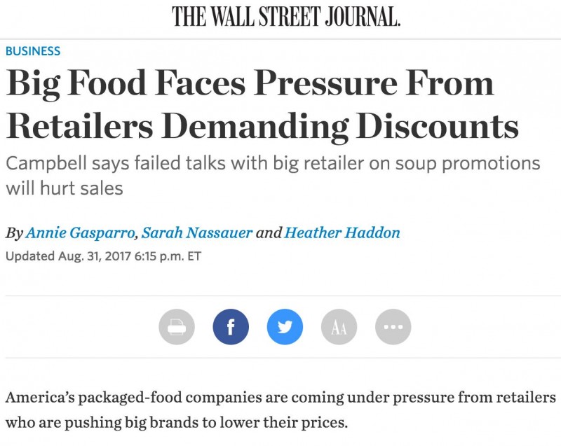 公开报道称,除了产品的吸引力在下降外,食品大公司面临的价格竞争也越发激烈。沃尔玛等连锁超市为了与快速扩张的德国折扣超市巨头Aldi和Lidl抗衡,一直在给他们的上游供应商压价。这一切都让食品大公司的CEO们更发愁了。