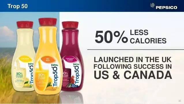 如今,瓶装水、低热量或无热量饮料、100%果汁和补水饮料等占据了美国饮料市场半数的销量,平均卡路里摄入量已经下降了近20%。因此,在这方面百事公司也增加了对研发的投资,以确保能为消费者提供低热量和无热量的美味产品。