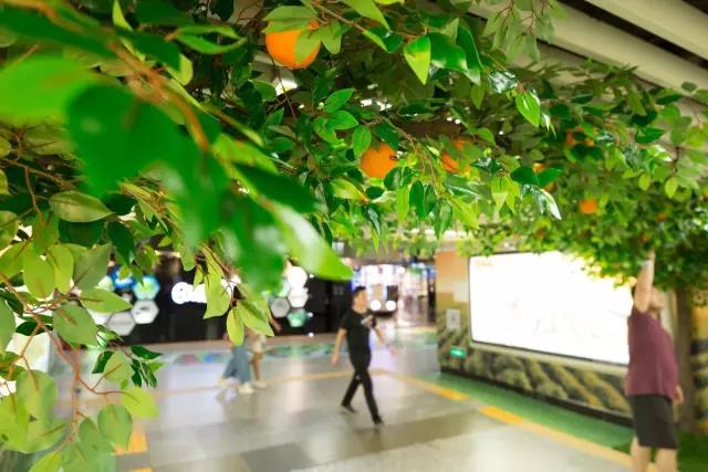繁茂的枝叶蔓延至冰冷的过道顶部,绿意爬满地铁通道。树上的血橙色泽鲜丽透亮,让人忍不住想伸手去采摘。