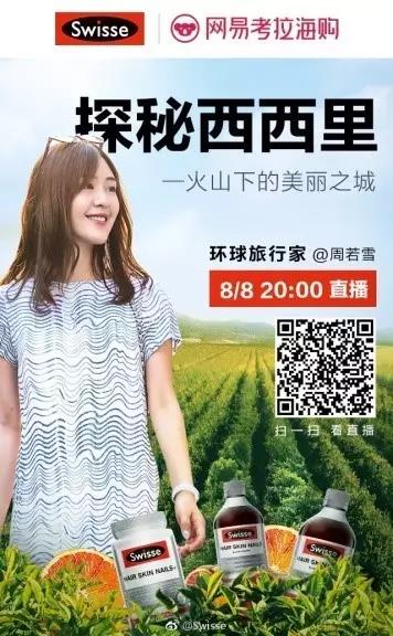 实体零售渠道的加强投入并未影响Swisse在电商平台的快速增长,Swisse血橙精华、蔓越莓精华等一系列优质原材料的溯源之旅正在持续展开,今年8月,Swisse就携手网易考拉海购邀请曾经走访40多个国家的旅行类KOL周若雪,亲赴意大利西西里埃特纳火山区的血橙庄园,揭开西西里火山下的美丽秘密。通过KOL探访农场、实验室的直播,深入浅出地介绍Swisse 西西里岛火山区血橙精华的原材料亮点——意大利西西里埃特纳火山区的塔罗科血橙,含有丰富的花青素、高剂量的保护细胞活性的成分,有助于促进胶原蛋白合成。