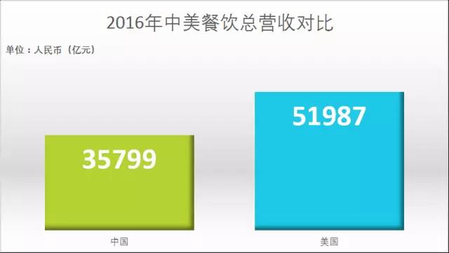 2016 年美国餐饮业营收总额为 7826.7 亿美元,折合人民币为 51987 亿元;中国餐饮业 2016 年营收总额达到 35799 亿元;美国餐饮业总营收是中国的 1.5 倍。