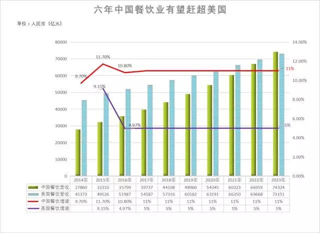 2016 年美国餐饮业营收总额为 7826.7 亿美元,折合人民币为 51987 亿元,同比增长 4.97% 。是中国餐饮业营收的 1.5 倍;六年后中国餐饮业有望赶超美国。