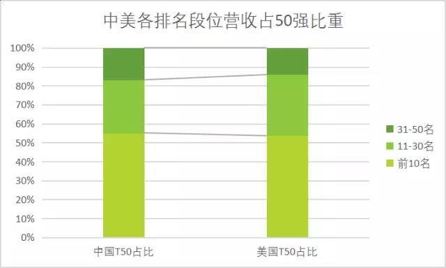 分析认为,相对可喜的是,中美餐饮的 50 强企业各排名段位的企业阵营划分基本一致。两个前 10 名的企业占 50 强的份额都达到 50% 以上,前 30 名的企业占 50 强的份额也都达到了 80% 以上。