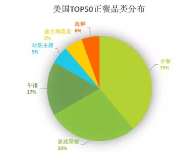 下面继续分解一下美国餐饮 50 强企业三大业态各自的品类分布: