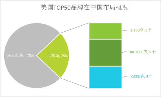 据不完全统计,美国餐饮 TOP50 品牌仅有 1/4 的企业在中国有布局,且发展态势迅猛。过 100 家门店的品牌有 9 个,其中,超过 1000 家门店的品牌多达 4 个。