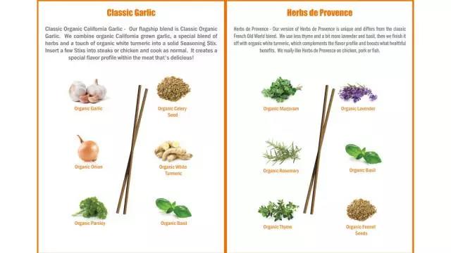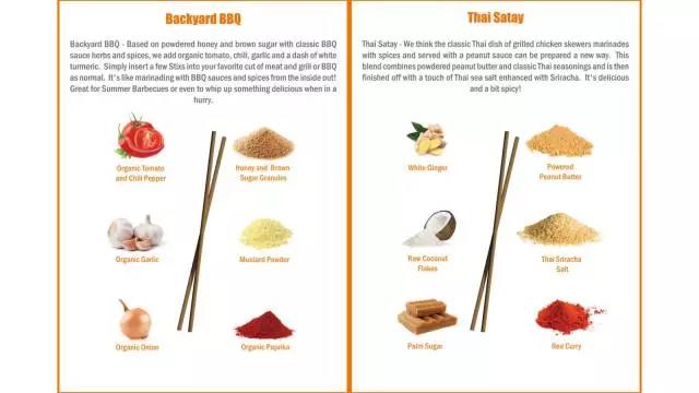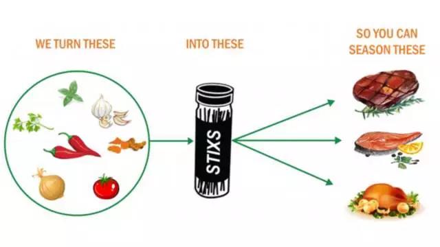 Seasoning Stix是一种被做成棍状的固态调味料,只需在烹饪之前将它插入鱼、肉之中,其中包含的许多香料和草药就会挥发出来。大约在华氏110度时,Seasoning Stix就会液化,使肉纤维吸收调味料所有的好处,由内而外,有效调味。