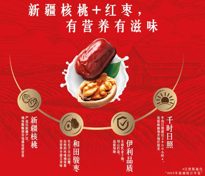 植物蛋白饮料在近几年迅速兴起。多家企业开始瞄准进入这一市场,各品牌的核桃乳、杏仁露、陈皮饮料等饮品层出不穷。核桃乳作为植物蛋白饮料的一大细分品类,市场竞争愈发激烈。伊利立足于对消费者的精确洞察,在核桃乳精选新疆好核桃的基础之上,大胆进行产品升级,推出红枣核桃乳新品。新品中创新添加了红枣成分,不仅在营养方面实现全面升级,同时也建立起了与其他同类产品在口味上的鲜明区隔,可谓一举两得,尽显差异化竞争优势。