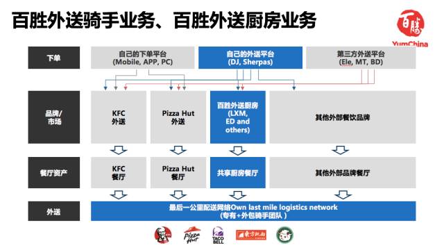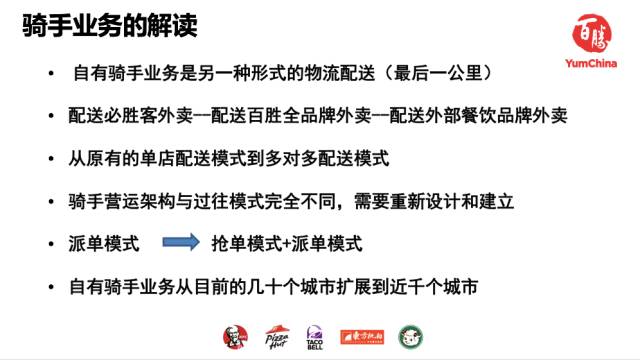 从配送必胜客外卖,同时还配送百胜全品牌外卖(肯德基、必胜客、东方既白、塔可贝尔,小肥羊)。更值得注意的是,还配送外部餐饮品牌外卖。