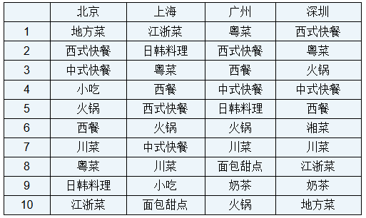 上表显示,双节期间,餐饮消费呈现地方特色,北京以地方菜、中式快餐、小吃等为主,上海以江浙菜、日韩料理、西餐为主,广州以粤菜、西餐为主,深圳以粤菜、火锅为主。