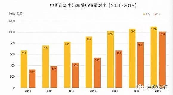 市场调研公司欧睿国际统计的2010-2016年间中国市场酸奶和牛奶的销量变化表显示,6年间,中国市场酸奶的销售从330亿元增长至1010亿元,而牛奶的销售从670亿元增长至1100亿元,显然,酸奶的销售增幅更快,照此趋势,在2017年,酸奶的销售将达到1220亿元,超越牛奶。