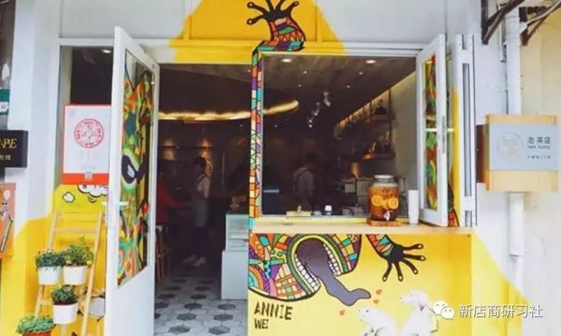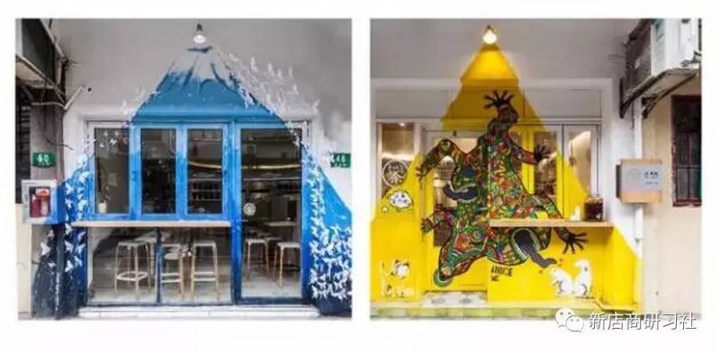 而黄白相间的门面上有一个大大的涂鸦,这种街头艺术般的绘画赋予了这家店更多的故事。涂鸦了“田园小怪兽”在门面上,更花俏,也更有立体感,也更能诠释这家店。