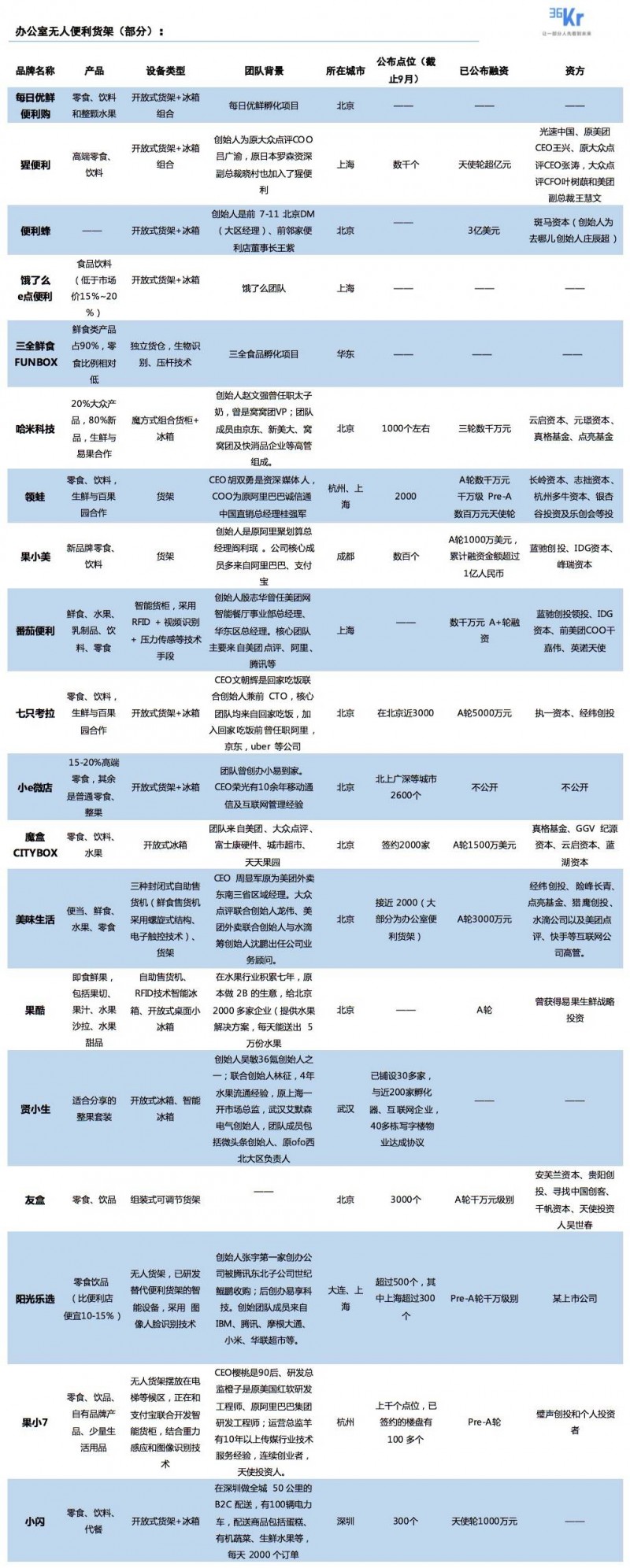 在开始讨论前,先放一张长长长图,包含了我们报道过的主要无人货架公司的基本信息。