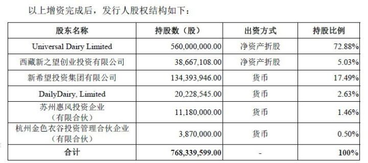 2015年,UniversalDairy Limited以 6.18 亿元价款收购新希望乳业100%的股权。其后,新希望乳业经历多次增、减资,2016年整体变更为股份有限公司。