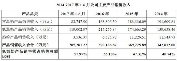 招股书显示,新希望新鲜低温奶产品销售额占销售总额的比例逐年上升,从2014年的40.74%上涨到2016年的55.18%,到今年上半年占比达到57.97%。