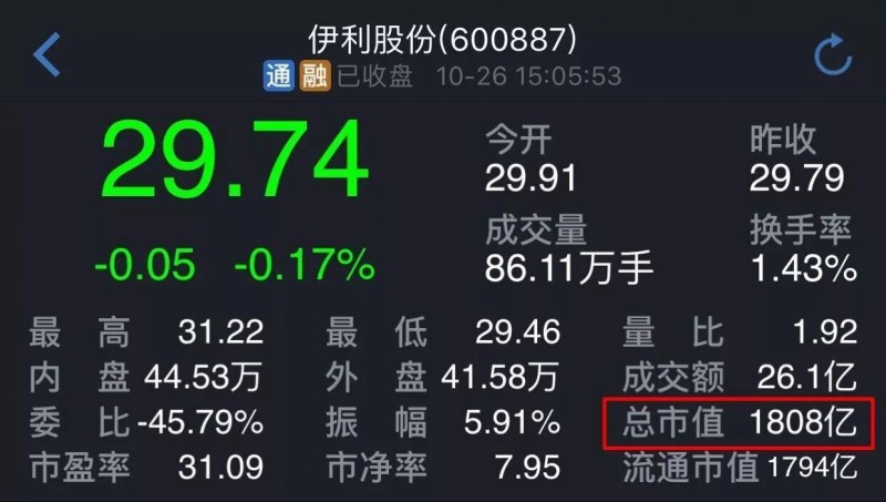 10 月 26 日,伊利股份一度涨近 5%,再度创出历史新高,总市值超1850 亿元。截至收盘,总市值达 1808 亿。而在 9 月27日,伊利 A 股市值才刚刚达到1551 亿元。自 5 月以来连番走强,伊利股价新高不断,年内涨幅已近 80%。