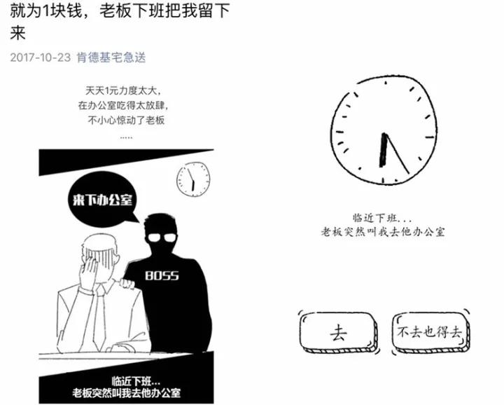 促销的第一原则毫无疑问是聚焦消费者的关注。而与以往“单纯用强烈的价格反差吸引眼球”的传统促销不同,KFC宅急送在“1元超值优惠”的基础上,制作并发布了一则名为“临近下班,老板突然叫我去办公室”的趣味H5,以日常工作场景为切入点贴近受众,采用循循渐进地叙事方式,结合漫画剧情式的花式脑洞,最终实现了为促销活动强势导流的目标。