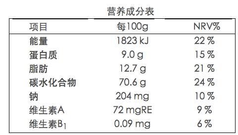 而营养成分表是标示食品中能量和营养成分的名称、含量及其占营养素参考值(NRV)百分比的规范性表格。例如: