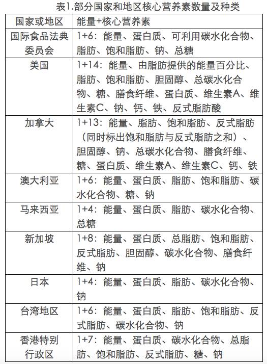 各国规定的核心营养素主要基于其居民营养状况、营养缺乏病、慢性病的发生率、监督水平、企业承受能力等因素确定。部分国家和地区规定的核心营养素如下表。
