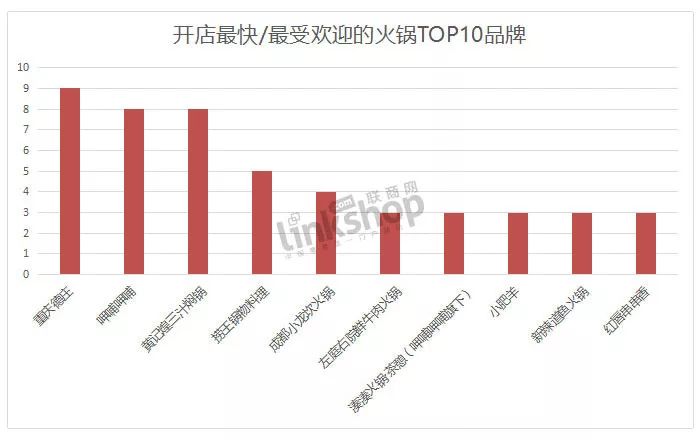 不分火锅类型来看,开店最快/最受欢迎的火锅及泛火锅TOP10品牌依次为:重庆德庄9家荣膺桂冠,呷哺呷哺简餐火锅与干锅系的黄记煌三汁焖锅各为8家并列亚军,台系捞王锅物料理5家摘得季军,成都小龙坎火锅4家,潮汕系左庭右院鲜牛肉火锅3家,呷哺呷哺旗下精品创新融合火锅湊湊火锅·茶憩3家,源自内蒙被百胜收编的小肥羊3家(肯德基必胜客的兄弟哦),新辣道鱼火锅3家,红唇串串香3家;由于各地口味差异巨大导致火锅品牌集中度非常低。