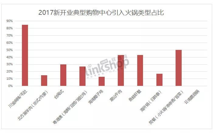 近年我国火锅的种类日趋多样化,对餐饮物业的需求旺盛,加之火锅对物业的油烟排污较其他类型餐厅简单,故大型购物中心引入了越来越多的火锅餐厅。据联商网研究中心统计,今年新开业的知名连锁集团旗下60家代表性的大型购物中心(商业面积8万平方米以上)平均引入了4家火锅。