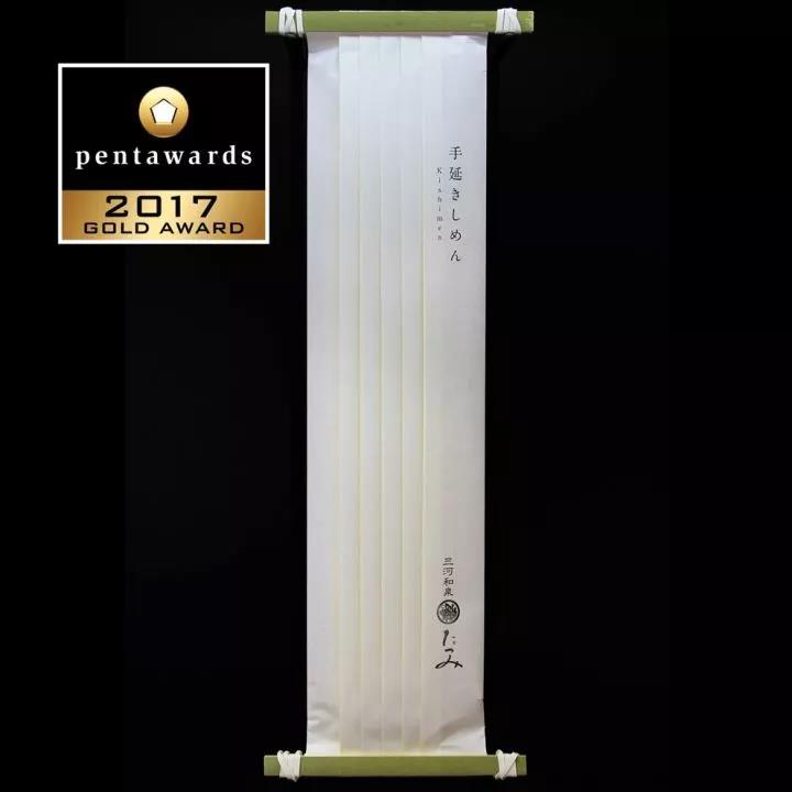 这种包装的乌冬面不使用刀具,纯手工制成,将面条悬挂在竹杆上干燥,纸包装两端用竹子夹紧并用橡皮筋固定。整体有力拉伸的感觉和简朴沉静的包装都显示出日本工匠的手作精神,也是对产品品质的升华。