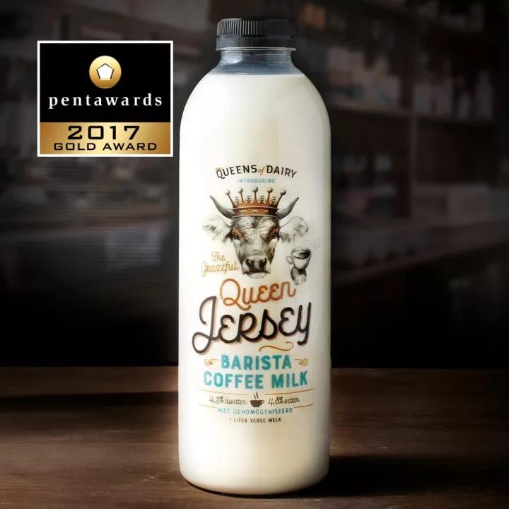 包装巧妙之处在于包装图案将产品品牌和产品原料完美结合,带皇冠的奶牛在品尝咖啡,生动且富有童趣。