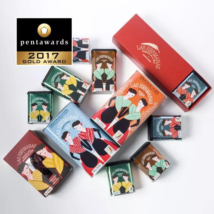 此次包装是对 “Pimentónde la Vera Las Hermanas”系列产品品牌包装的重新设计。原始设计将产品包装设计为黑色的罐头,新的包装使用金属化的罐子结合丰富的颜色使产品更加生动,并且能更清楚地突出品牌所提供的三种类型的辣椒粉。