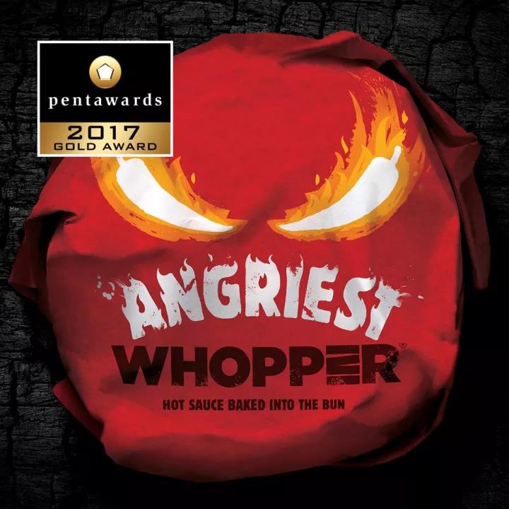 该包装是为快餐店设计的打包食品的包装,外观颜色艳丽、吸人眼球,将辣椒拟人化成喷火的双眼,生动地匹配文字意思、体现出产品口味。