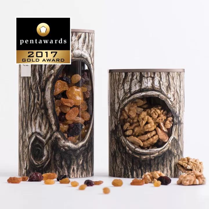 该包装外观模拟树干,并且将树洞设计为透明外观,有刺激人一探究竟的冲动。通过这样的外观设计,购买者能清晰地看到产品的内容物状态,赋予产品新奇、天然和健康的感觉。