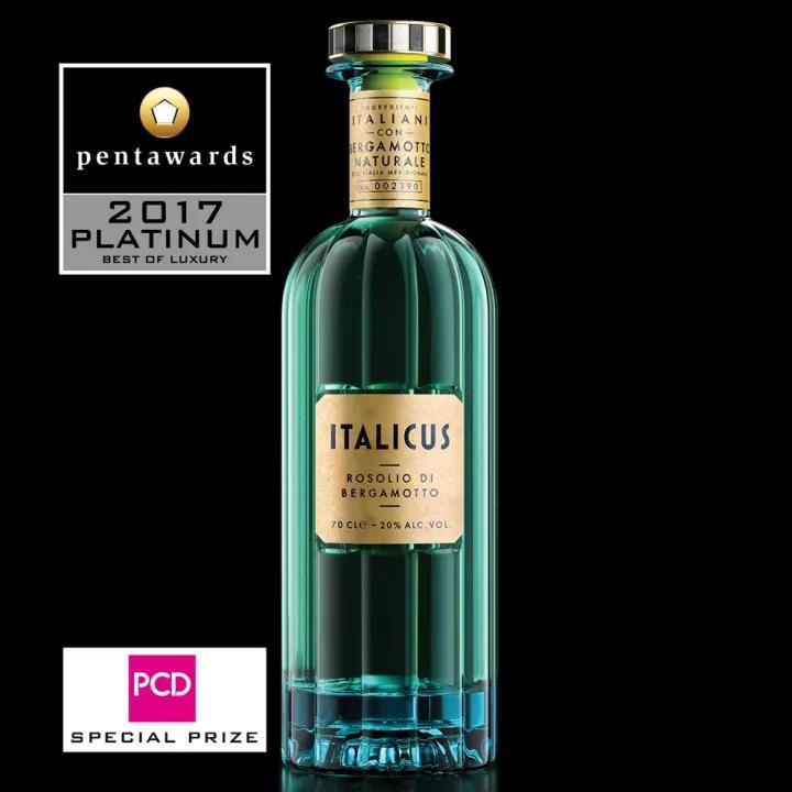 Italicus 是意大利著名的“国王饮料”。关于这个瓶子的文字设计都是源自典型的意大利语,而蓝绿色的色调表明了地中海的起源。整体简洁的流线型、标签和字体各方面都体现其奢华感。