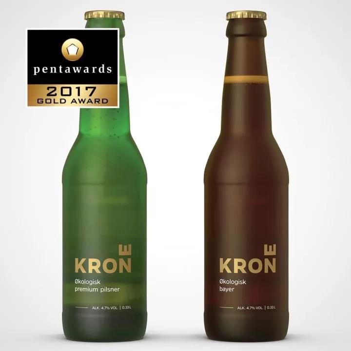 Crown是挪威新的啤酒品牌。极简设计体现了这款啤酒的天然成分,同时避免了陈旧的啤酒外观设计。 Krone中的E以水平方向显示,整个Krone字符呈现金色。磨砂玻璃瓶外观更使其在商店架上脱颖而出。