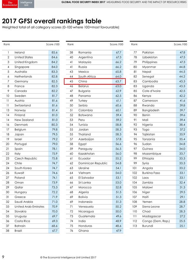 2017年《全球食品安全指数报告》实况