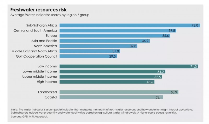 食品安全指数最高的十五个国家为:爱尔兰、奥地利、法国、美国、德国、瑞士、英国、加拿大、丹麦、瑞典、荷兰、新西兰、芬兰、澳大利亚、挪威。食物安全指数最低的十五个国家是:圭亚那、埃塞俄比亚、莫桑比克、赞比亚、安哥拉、叙利亚、马拉维、尼日尔、海地、塞拉利昂、乍得、也门、马达加斯加、布隆迪、刚果(金)。