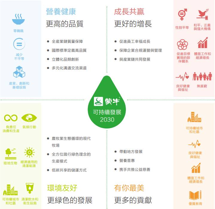 在上述可持续发展报告中,蒙牛还提出将以打造世界一流乳制品企业为目标,聚焦“营养健康”、“成长共赢”、“环境友好”、“有你最美”4大核心议题,制定可持续发展2030策略,贡献全球可持续发展目标的实现。