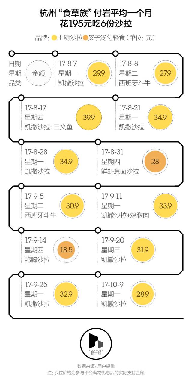 新一酱瞄了一眼付岩的订单,他最常吃的凯撒沙拉在外卖平台上标价37.8元——算上折扣后,他愿意为这种高蛋白、低脂低碳水化合物的饮食方式实际付出每顿30元左右的价钱。
